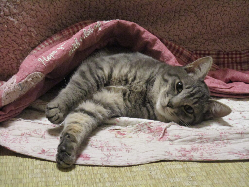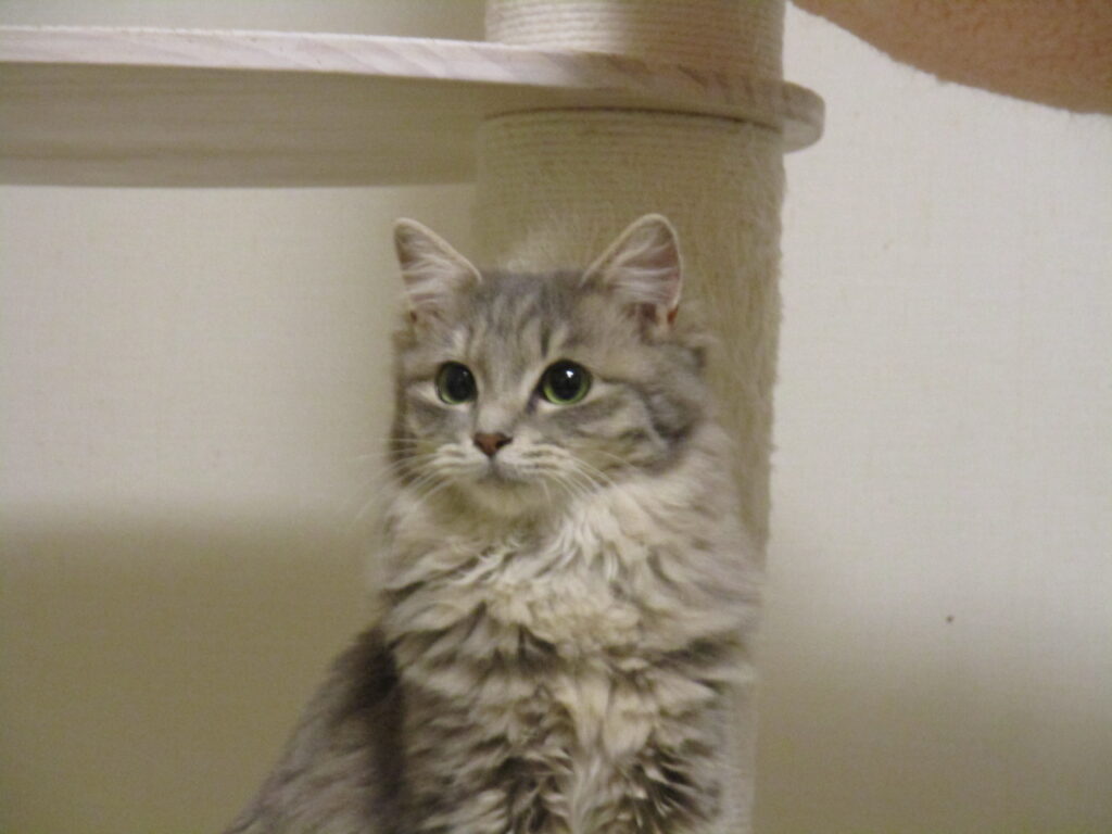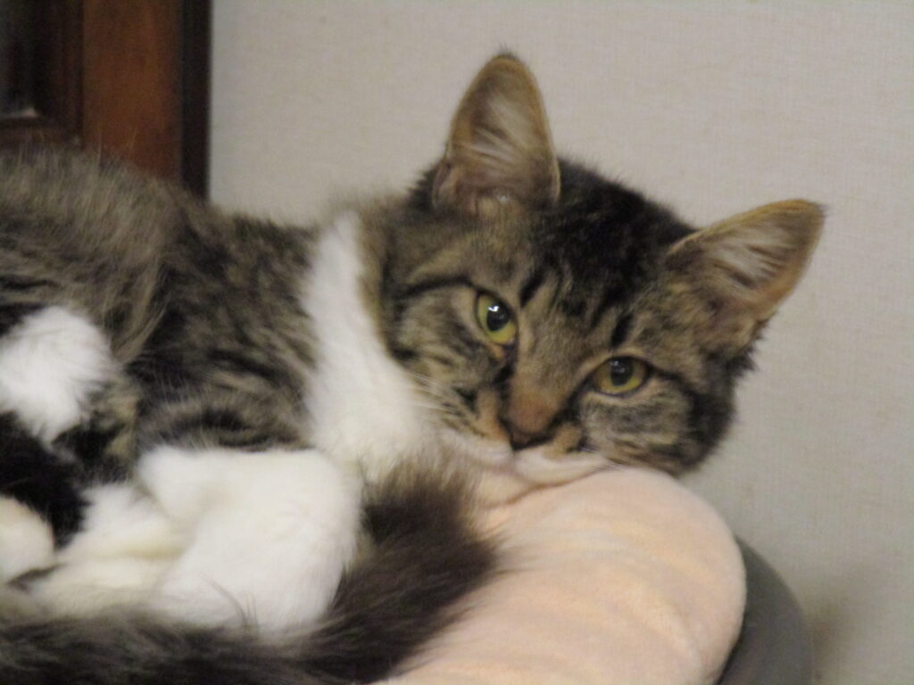 慢性化している風邪の治療は注射に通いながらしました。なかなか風邪症状がスッキリしないので点眼、投薬をわりと続けました。体力がついてからは、だいぶ良くなりました。外にいる時はスリスリと慣れていたほく♀ちゃんでしたが、産まれて半年を外で過ごしたので思ったより、おうちの中の生活に慣れるまで鳴いたりしました。えむ♀ちゃんは、おうちの中の生活に馴染むまで少し戸惑いました。