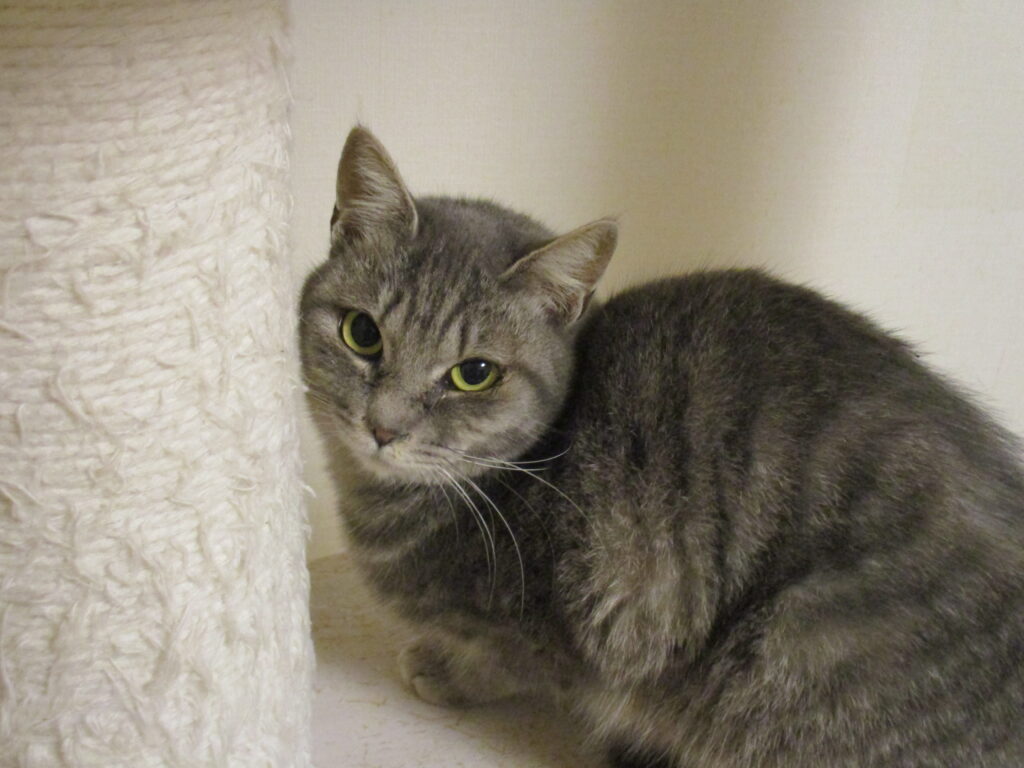 目薬をしたくても、すごく嫌がり無理やりすると怖がらせてしまうので、できない事が多いです。2人とも室内の生活には慣れ、楽しく走ったりおもちゃで遊んだりタワーに登ったりしています。寝ている時なら触れますが捕まえようとすると逃げます。ご飯はちょーだい!と来ます。ググ♀は控えめな子で、ムク♀は活発です。去年の春子と一昨年の春子で1年違いますが同じ場所で産まれ育っていたので仲良しです。臆病なため、2匹で迎えてくれる人を希望します。