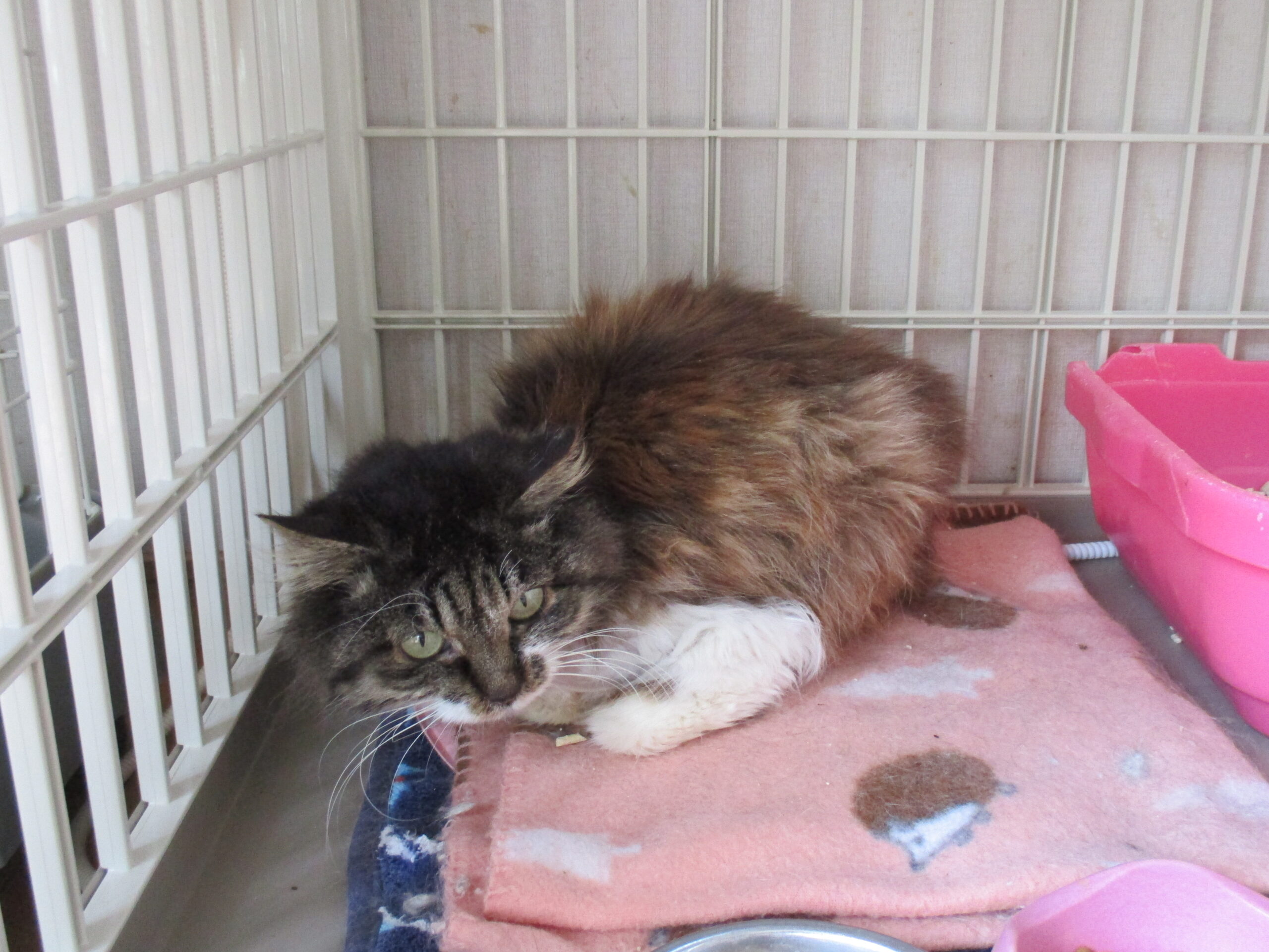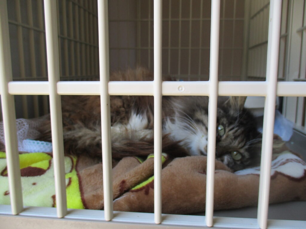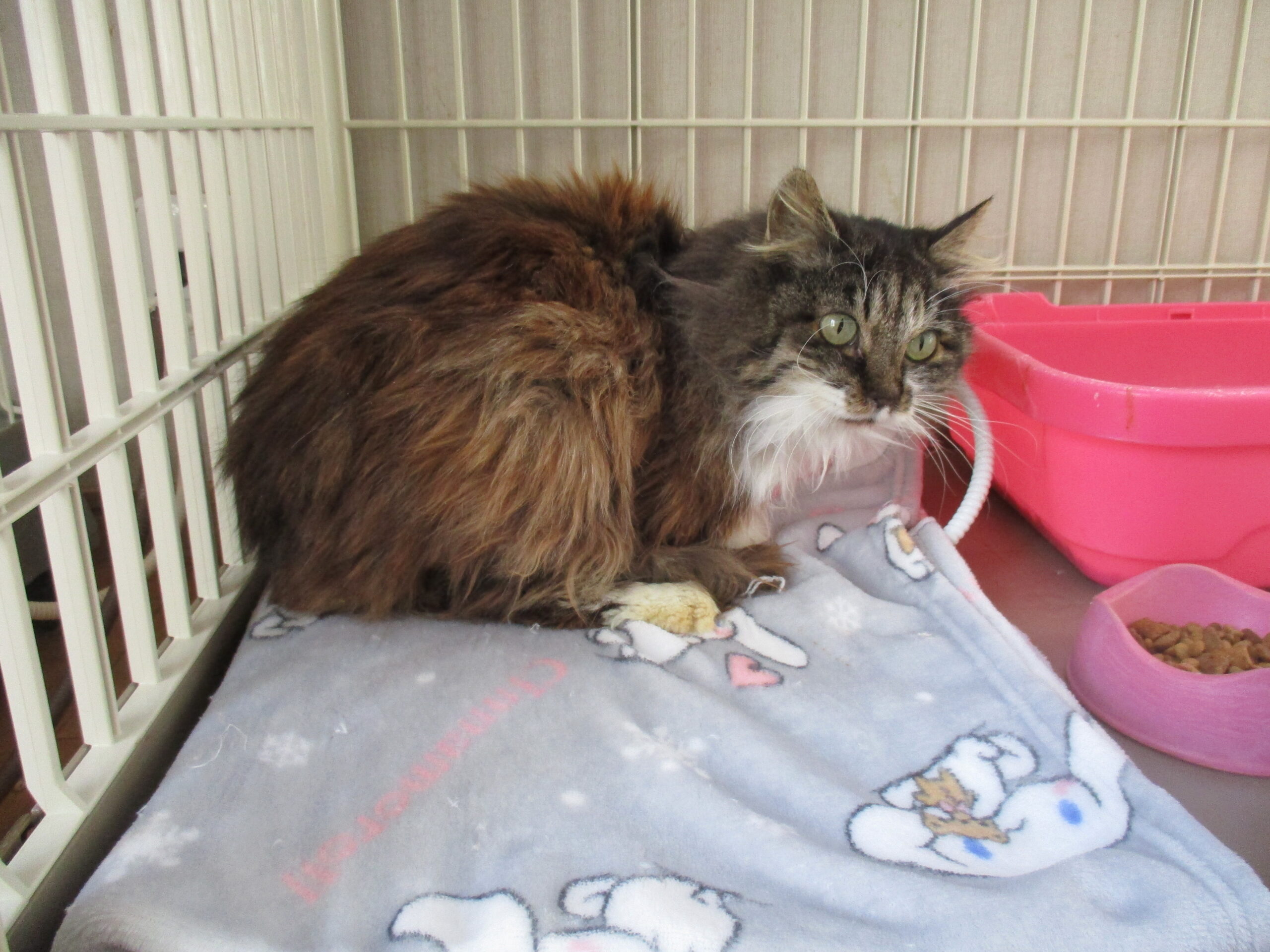 今日は、去年12月にTNRのため捕獲したんですがガリガリで手術ができなかった子、どうも老描?の子のお話しです。ミウ♀と同じ場所にいました。ほとんど動かず、建物の下にうずくまっていることが多かったです。真冬に捕まえましたし、手術もできないまま元に戻すことはできないですから保護しました。大人しい子でケージから出ようとしません。
