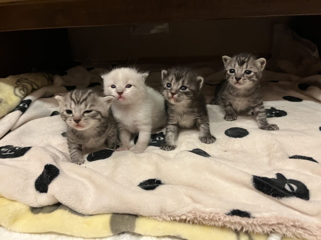 3/20産まれなので、まだ生後1ヶ月と1日の赤ちゃんです。小さくて目の炎症している子が数匹。個人ボランティアさんのお宅で母と一緒にいておっぱいを飲んでいたので、自分の口で食べる練習はあんまりしてなかったかな。目の炎症の治療もしてくれていましたが、なかなか😥と言っていました。点眼がんばろうね。
