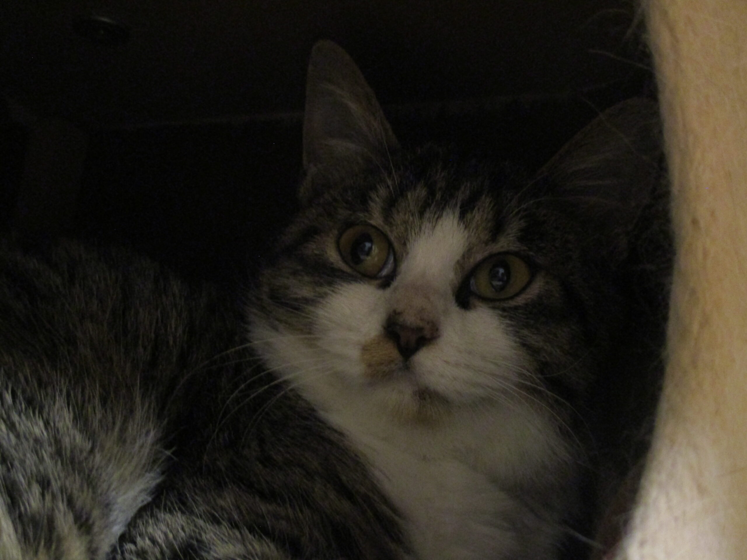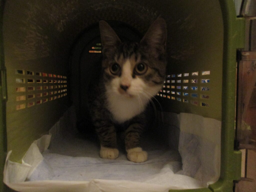 知り合いの人から、エサやりをしている成猫の所に仔猫が現れて・・・と電話がありました。人に慣れているそうで、きっと誰かがその場所に成猫がいるのを知って置いていったようです。人に慣れているというので飼われていたのでしょう。当時、たくさんの子を抱えていたので、どなたか預かってくれる人を探してほしい と言いました。しばらくして、その子の事が気になっていたので保護してもらえたか❔連絡すると探してくれたようですが、なかなか見つからないとの事でした。成猫のお兄ちゃんにくっついて仲良くしていると言っていました。が女の子と言っていましたし、秋も深まり朝晩は冷えるようになってきたので、まだ外にいるなら保護します と引き取りました。あら、かわいい💠この子です↓