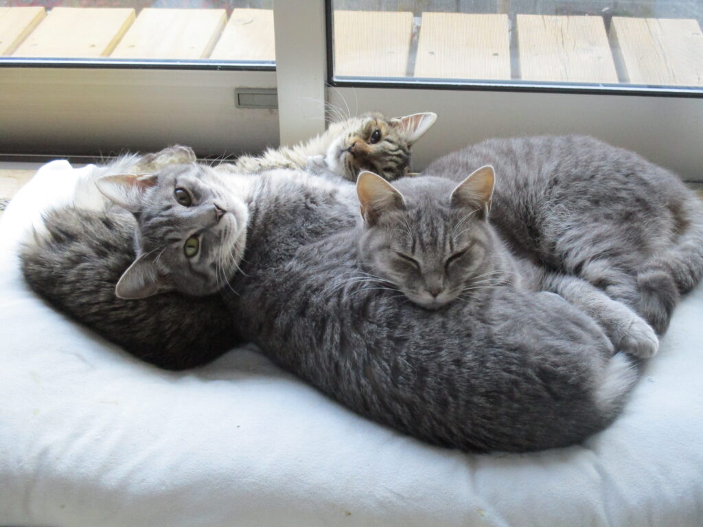 他、これから募集コーナーに載せる子3匹、あとはみんな成猫です。毎日、穏やかに過ごしてます(㊤からむぎ♀ スモモ♀ もこ♀ギンガ♂ググ♀)