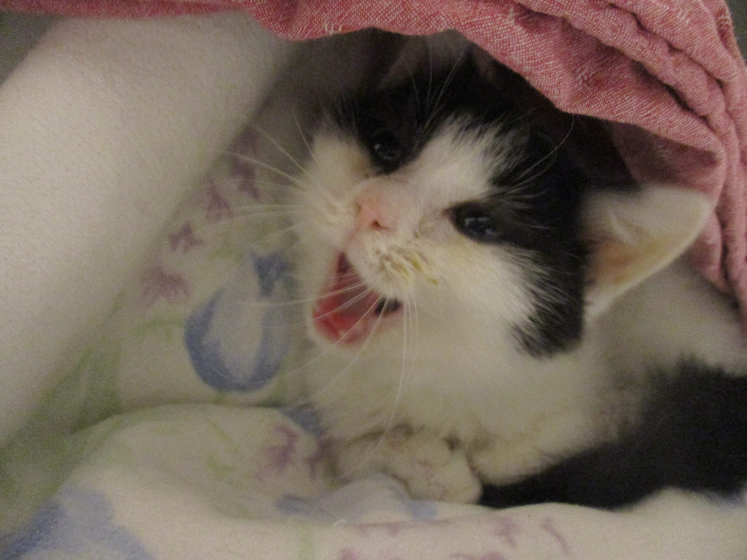 お腹が空いていたようでパウチを食べたとの事。どこか外で産まれたか遺棄されたと思われます。
