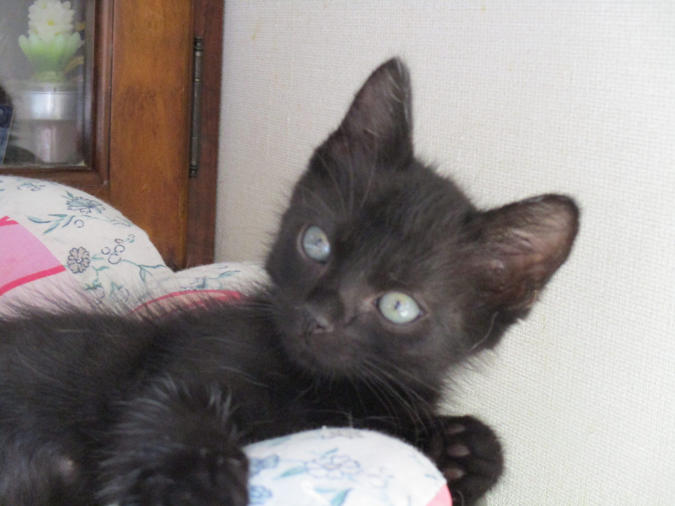 ななつごと同じおうちで産まれました。1匹は、すでに巣立ちました。母猫は、ななつごの母が5年ほど前に産んだ子です。生後1ヶ月まで母猫のおっぱいで育ちました。離乳訓練、おトイレトレーニングも順調で小さかったですが、しっかり食べてミルクも飲んでスクスク育っています。どの子もなつっこくて可愛いです。先住猫のいるおうちか2匹で迎えてくれる人を希望します。黒の男の子、人馴れ元気💮